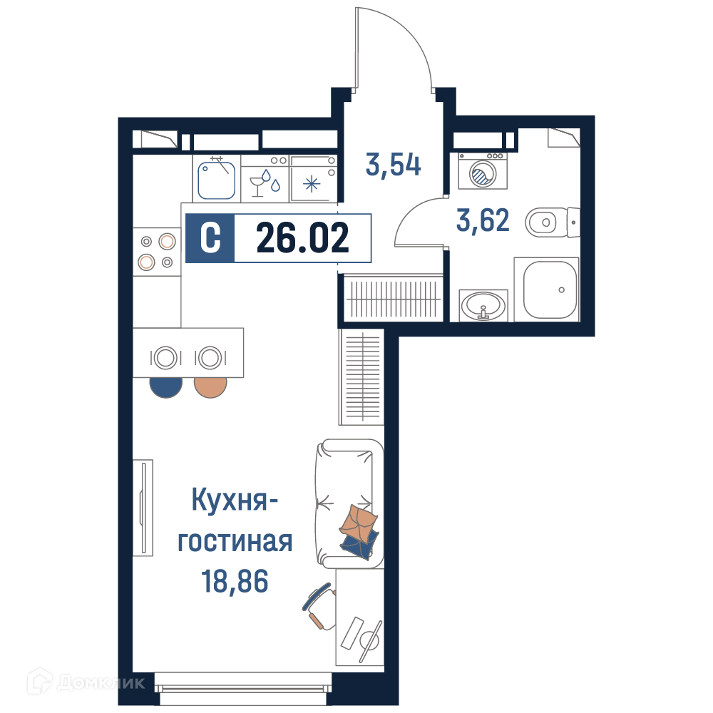 - Общая площадь: 26.02 м²
