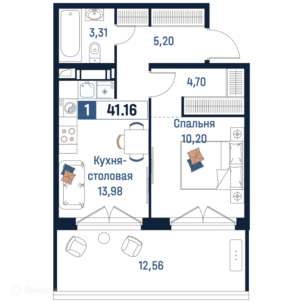 - Общая площадь: 41.16 м²