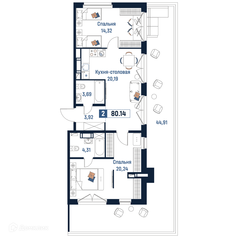 - Общая площадь: 80.14 м²