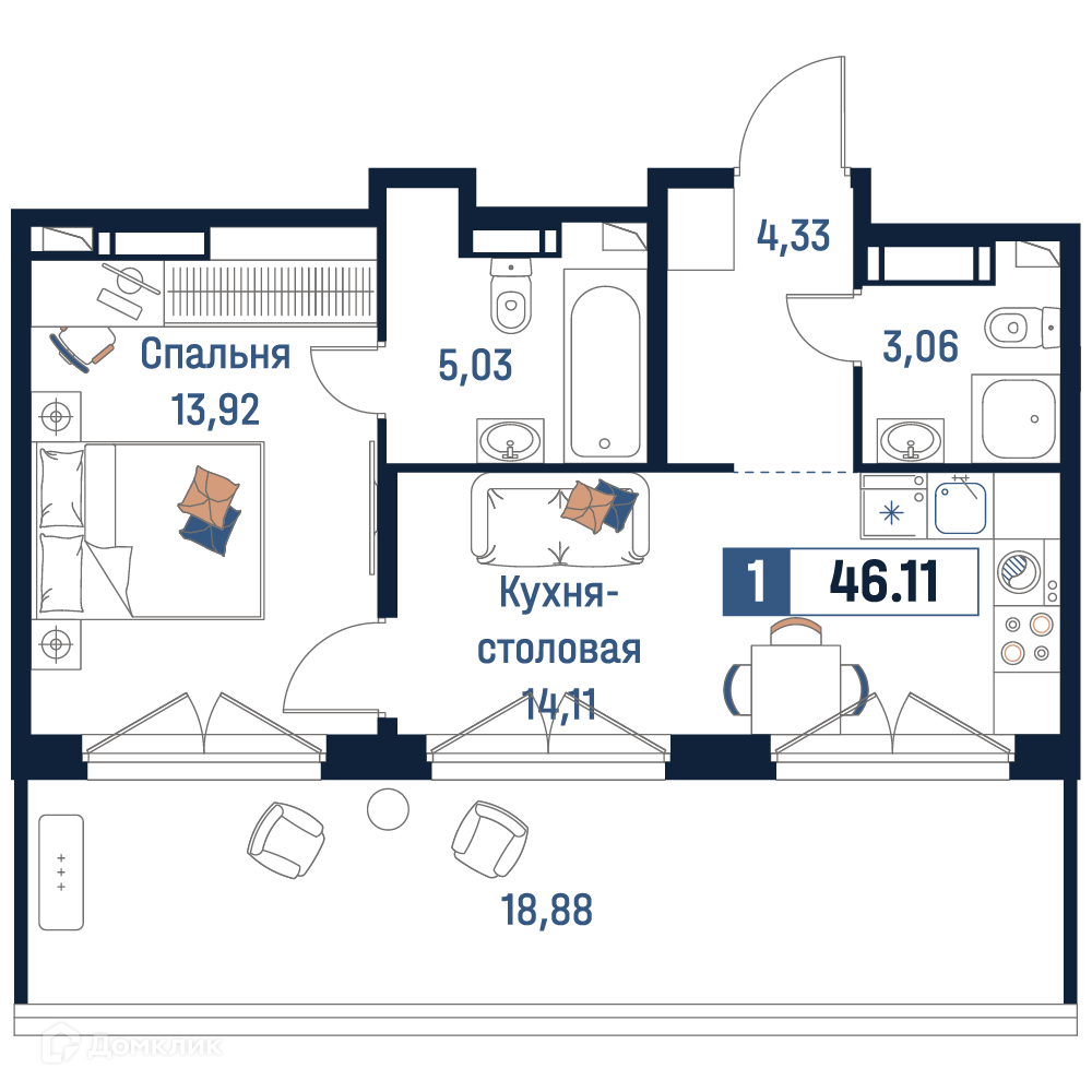 - Общая площадь: 46.11 м²