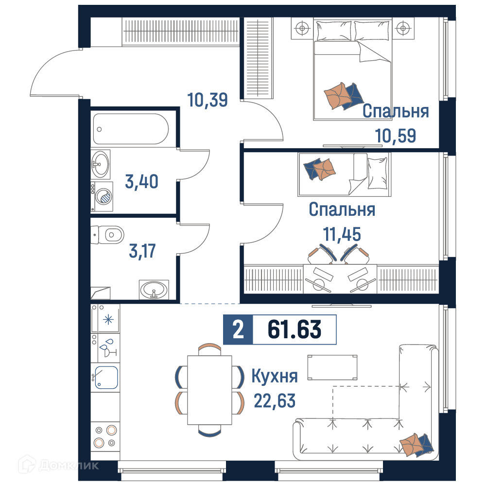 - Общая площадь: 61.63 м²