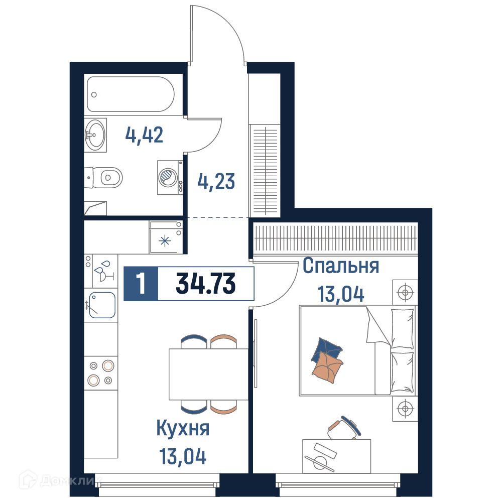 - Общая площадь: 34.73 м²