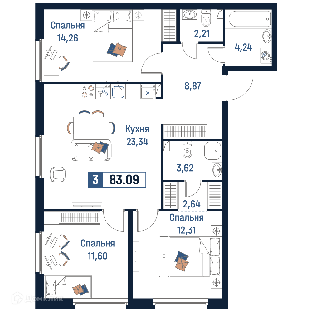 - Общая площадь: 83.09 м²