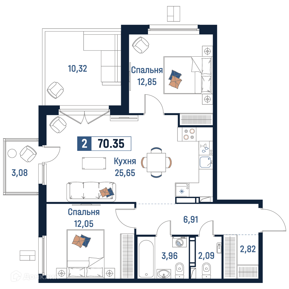 - Общая площадь: 70.35 м²