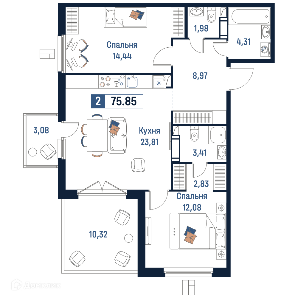 - Общая площадь: 75.85 м²