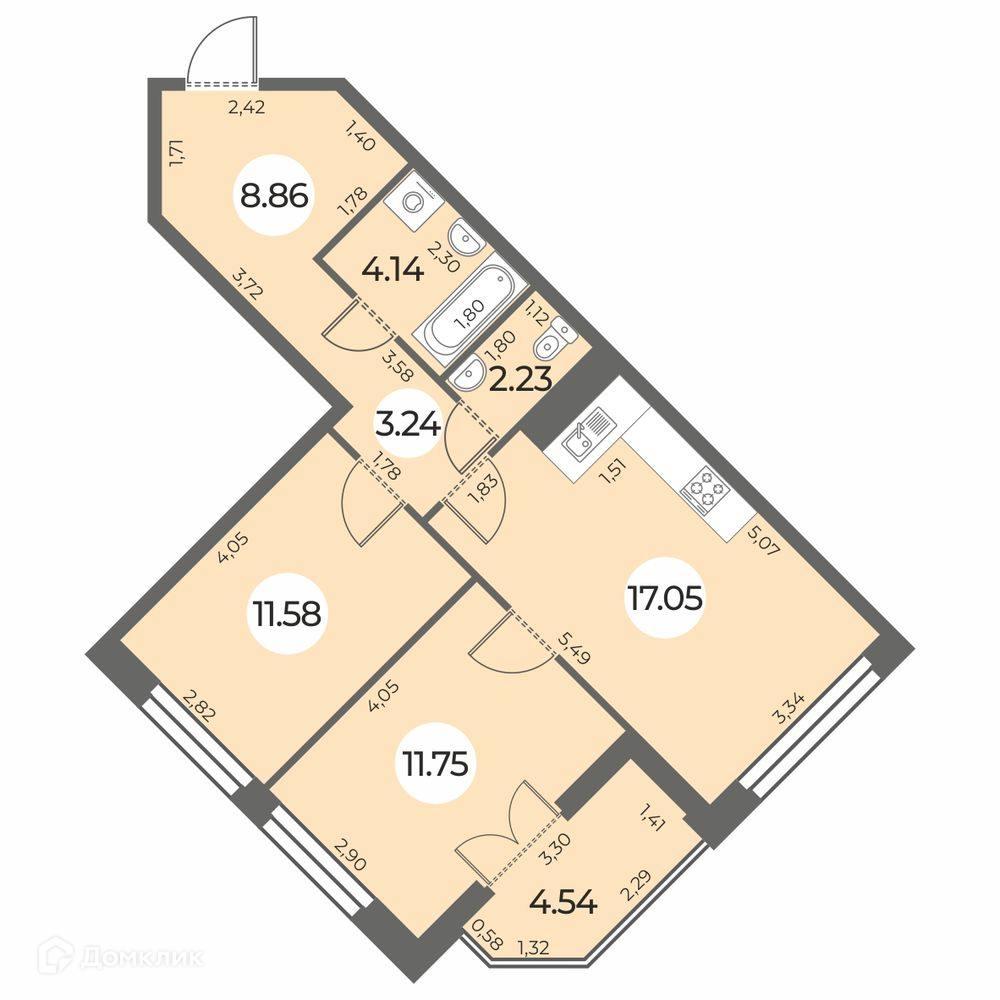 • Площадь кухни - 17.05 м²
