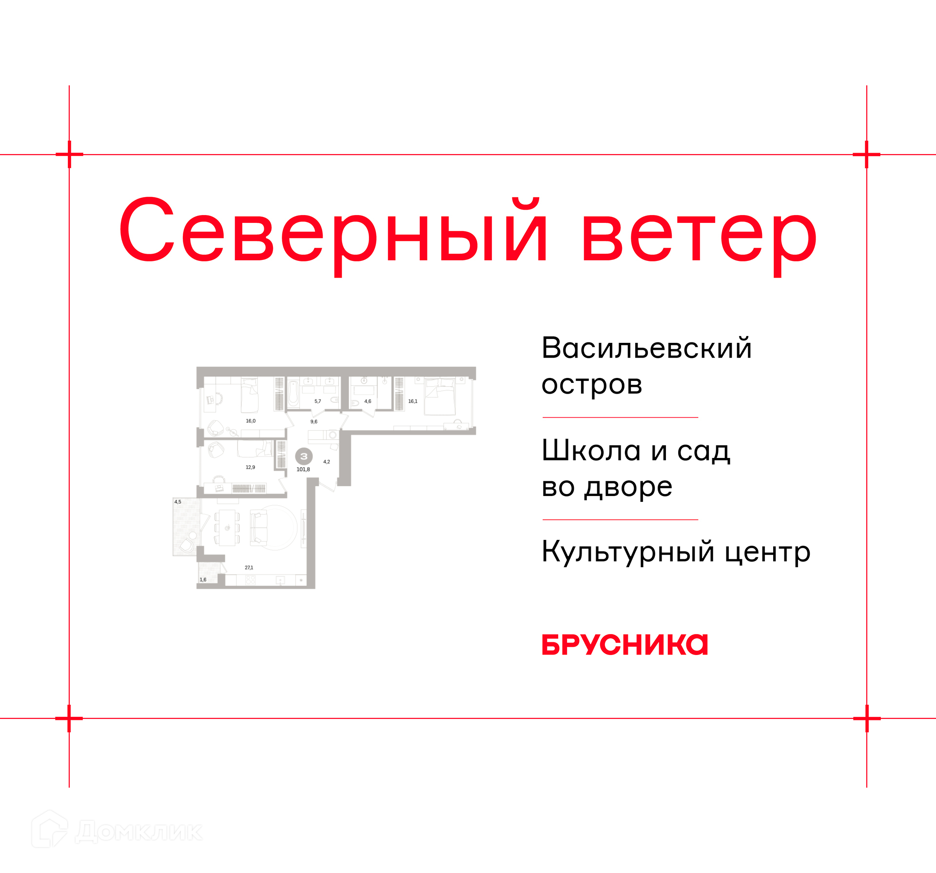 Квартал “Северный ветер” - проект у залива с парком, арт-локациями и богатой инфраструктурой. В проекте представлены дома с разнообразными планировочными решениями: квартиры с мастер-спальнями и большими кухнями, двухуровневые квартиры, террасы на первых и верхних этажах, квартиры с отдельным входом и палисадником, квартиры с видом на залив, уникальные трехэтажные таунхаусы. Всего - 67 типов планировочных решений. Высокие потолки от трех метров - даже на типовых этажах - и панорамные окна в пол наполнят квартиры светом и воздухом. Каждая деталь здесь проработана досконально: интерьерные лобби и холлы, парадные с живыми растениями, ярким декором и мягкой мебелью, дизайнерский паркинг. Ярким акцентом проекта станут веранды - просторные остекленные помещения на крыше урбан-вилл. Расположение, транспортная доступность Васильевский остров давно стал центром притяжения коренных петербуржцев и гостей города. Это локация неразрывно связана с историей Санкт-Петербурга, а сегодня Васильевский - один из самых престижных районов города. Здесь располагаются сильнейшие гимназии и ВУЗы, входящие в ТОП-100 по стране, гастрономические и культурные пространства, а когда хочется красивых закатов, можно отправиться гулять по живописной Университетской набережной или вдохновляться видами Финского залива. Именно здесь, на берегу большой воды, расположился квартал “Северный ветер”. До выезда на ЗСД, который связывает жителей Васильевского острова с любым районом Петербурга, всего 3 минуты на автомобиле. Дорога до Невского проспекта займет 25 минут, а до аэропорта Пулково - 30-35 минут. Ближайшая станция метро - Приморская, 10 минут на автомобиле. В 3-х минутах пешком - остановка общественного транспорта “пр. Крузенштерна”. В планах развития города строительство станции метро “Морской Фасад”. Инфраструктура В основу концепции проекта легла идея деления квартала на шесть кластеров — активный городской, тихий природный, спортивный, семейный, культурный и рекреационный. Внутри каждого кластера будут организованы разные по характеру площади со своим назначением. Событийная — для массовых мероприятий, гастрономическая — для вкусных перекусов, спортивная — чтобы держать себя в форме, площадь спокойствия и тишины — для отдыха и семейная — для игр с детьми. Всё это свяжет кольцевой бульвар, соединенный с большим парком и сопровождаемый водными аллеями по периметру всего квартала. Гуляя по кольцу, вы сможете выбрать пространство, которое в текущий момент рифмуется с вашим настроением. В центре квартала расположится школа и детский сад. Первые этажи домов со стороны двора займут помещения коммерческой функции: всевозможные рестораны и винотеки, магазины одежды и предметов декора, супермаркет, медклиника, пекарни и кофейни. На западной стороне в глубине парковой зоны разместится «тихая» коммерция — SPA, студии массажа, студии дополнительного образования. Со стороны улицы расположатся магазины, гастробары, салоны красоты, аптеки и цветочные лавки. Многофункциональный культурный центр станет точкой сборки множества общественных функций. В соседском центре - визитной карточке Брусники - можно будет работать и назначать бизнес-встречи, организовывать общие собрания собственников, семейные праздники или турниры по шахматам, читать лекции, прово