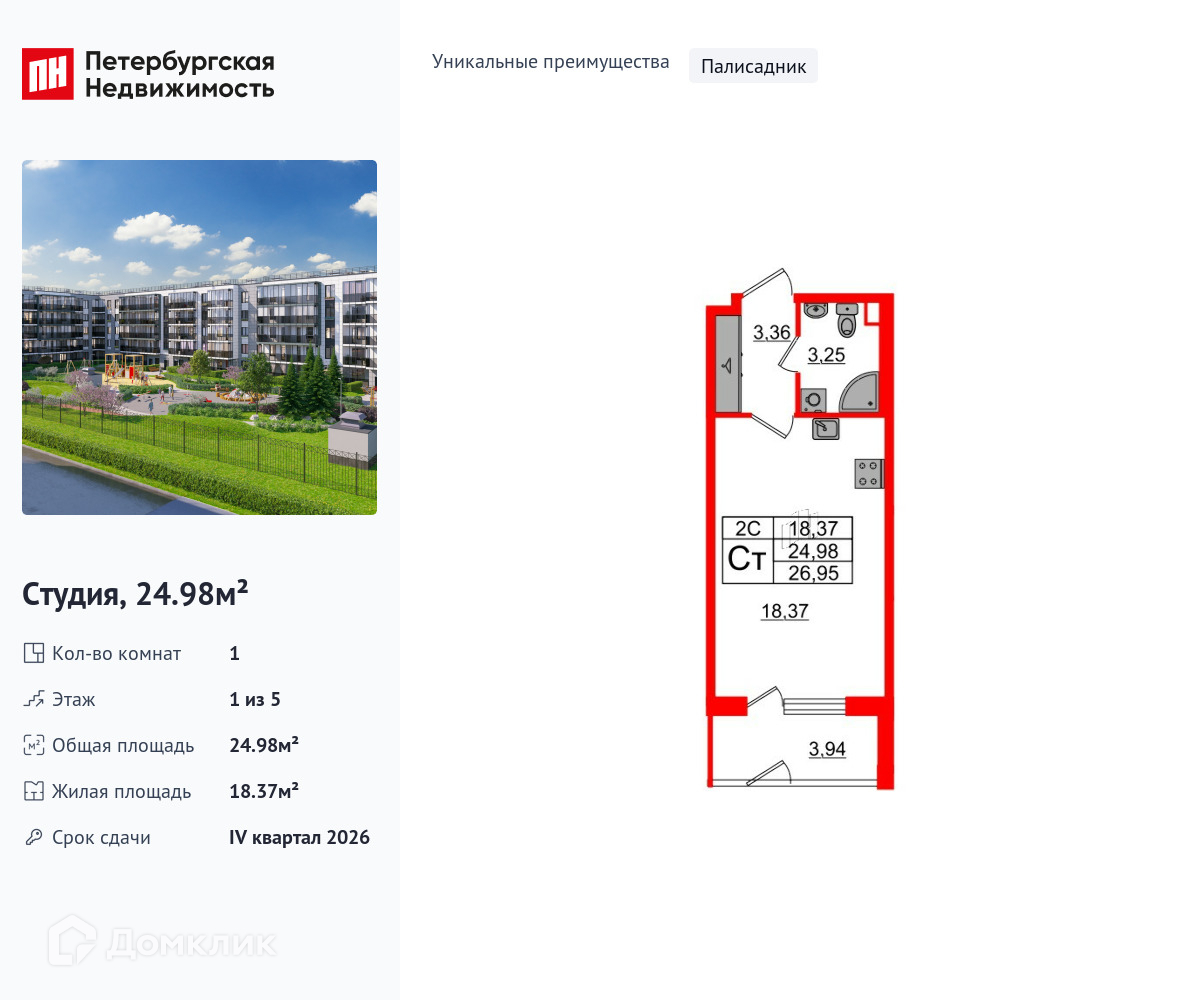 • Площадь - 24.98 м²