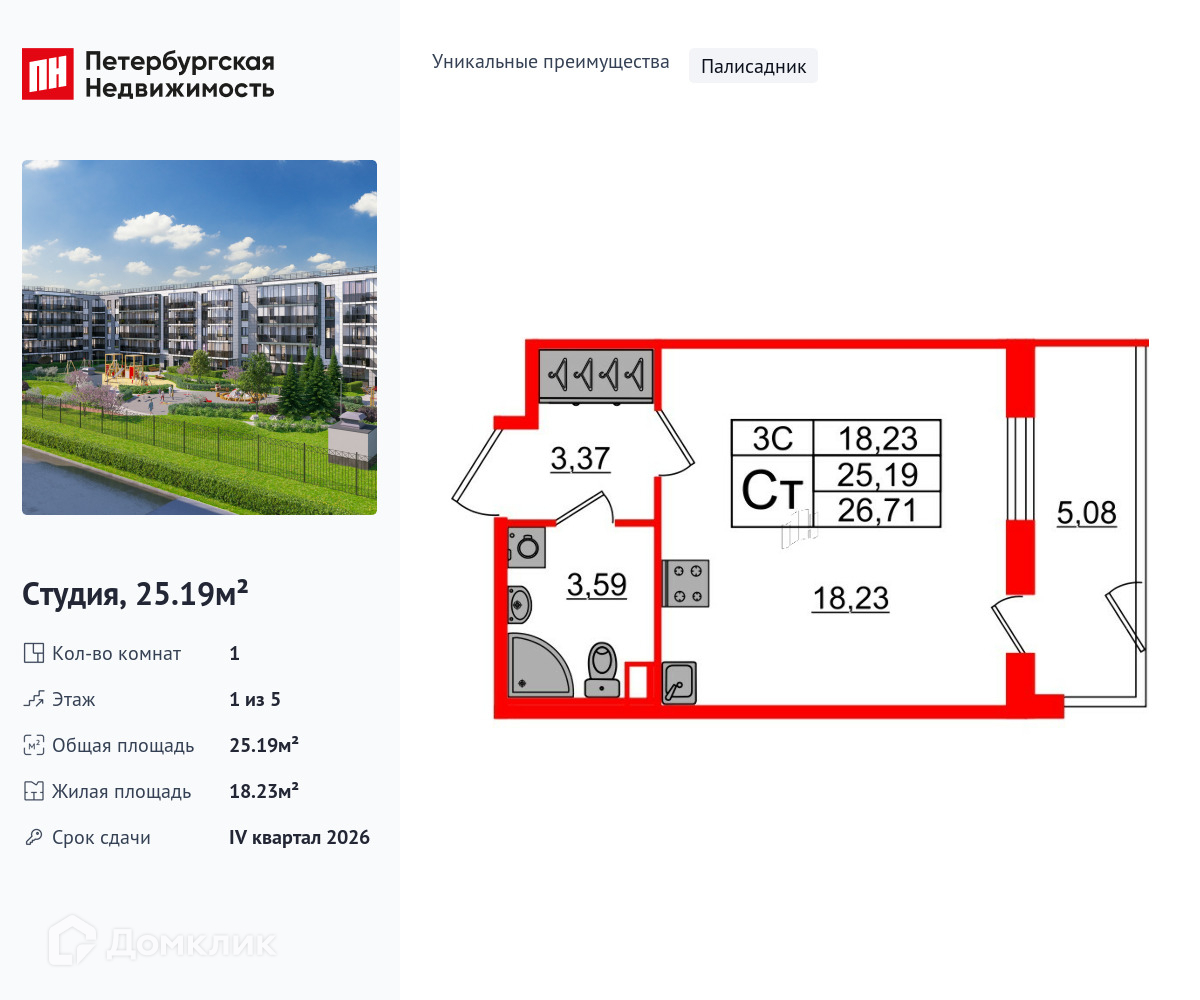 • Площадь - 25.19 м²