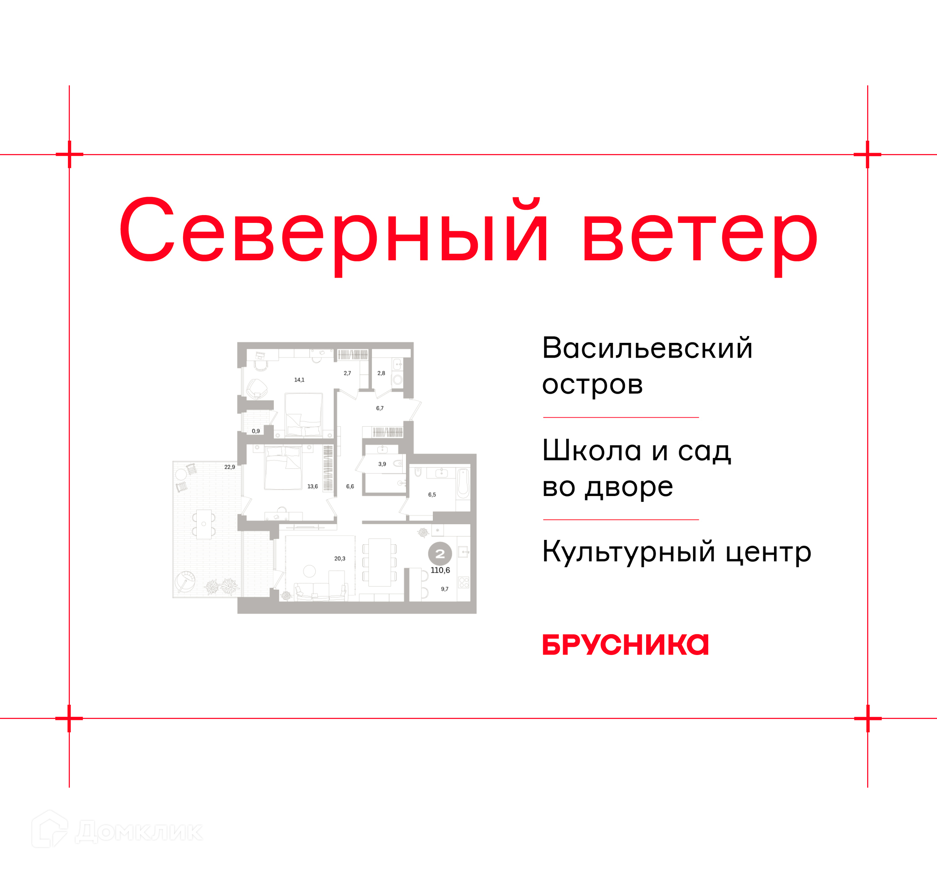 Квартал “Северный ветер” - проект у залива с парком, арт-локациями и богатой инфраструктурой. В проекте представлены дома с разнообразными планировочными решениями: квартиры с мастер-спальнями и большими кухнями, двухуровневые квартиры, террасы на первых и верхних этажах, квартиры с отдельным входом и палисадником, квартиры с видом на залив, уникальные трехэтажные таунхаусы. Всего - 67 типов планировочных решений. Высокие потолки от трех метров - даже на типовых этажах - и панорамные окна в пол наполнят квартиры светом и воздухом. Каждая деталь здесь проработана досконально: интерьерные лобби и холлы, парадные с живыми растениями, ярким декором и мягкой мебелью, дизайнерский паркинг. Ярким акцентом проекта станут веранды - просторные остекленные помещения на крыше урбан-вилл. Расположение, транспортная доступность Васильевский остров давно стал центром притяжения коренных петербуржцев и гостей города. Это локация неразрывно связана с историей Санкт-Петербурга, а сегодня Васильевский - один из самых престижных районов города. Здесь располагаются сильнейшие гимназии и ВУЗы, входящие в ТОП-100 по стране, гастрономические и культурные пространства, а когда хочется красивых закатов, можно отправиться гулять по живописной Университетской набережной или вдохновляться видами Финского залива. Именно здесь, на берегу большой воды, расположился квартал “Северный ветер”. До выезда на ЗСД, который связывает жителей Васильевского острова с любым районом Петербурга, всего 3 минуты на автомобиле. Дорога до Невского проспекта займет 25 минут, а до аэропорта Пулково - 30-35 минут. Ближайшая станция метро - Приморская, 10 минут на автомобиле. В 3-х минутах пешком - остановка общественного транспорта “пр. Крузенштерна”. В планах развития города строительство станции метро “Морской Фасад”. Инфраструктура В основу концепции проекта легла идея деления квартала на шесть кластеров — активный городской, тихий природный, спортивный, семейный, культурный и рекреационный. Внутри каждого кластера будут организованы разные по характеру площади со своим назначением. Событийная — для массовых мероприятий, гастрономическая — для вкусных перекусов, спортивная — чтобы держать себя в форме, площадь спокойствия и тишины — для отдыха и семейная — для игр с детьми. Всё это свяжет кольцевой бульвар, соединенный с большим парком и сопровождаемый водными аллеями по периметру всего квартала. Гуляя по кольцу, вы сможете выбрать пространство, которое в текущий момент рифмуется с вашим настроением. В центре квартала расположится школа и детский сад. Первые этажи домов со стороны двора займут помещения коммерческой функции: всевозможные рестораны и винотеки, магазины одежды и предметов декора, супермаркет, медклиника, пекарни и кофейни. На западной стороне в глубине парковой зоны разместится «тихая» коммерция — SPA, студии массажа, студии дополнительного образования. Со стороны улицы расположатся магазины, гастробары, салоны красоты, аптеки и цветочные лавки. Многофункциональный культурный центр станет точкой сборки множества общественных функций. В соседском центре - визитной карточке Брусники - можно будет работать и назначать бизнес-встречи, организовывать общие собрания собственников, семейные праздники или турниры по шахматам, читать лекции, прово