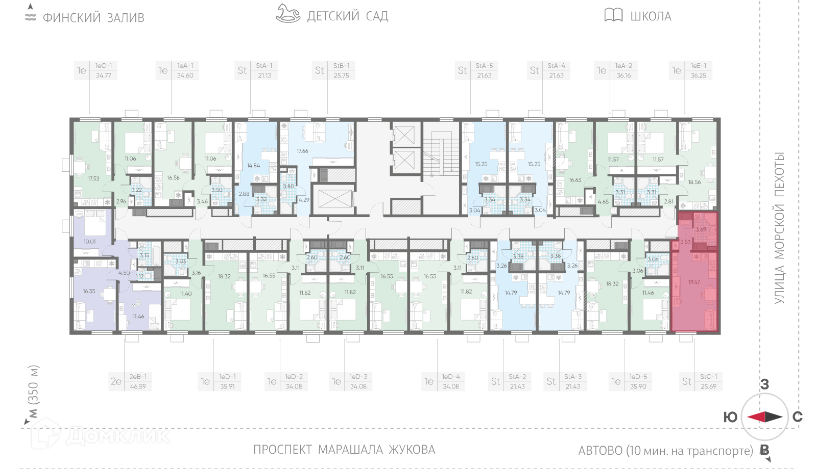 «Морская миля» – это новый проект компании «ЛСР», жилой комплекс комфорт-класса возводится у побережья реки Красненькая, в окружении водоемов, впадающих в Финский залив. В состав проекта войдет десять 25-этажных корпусов. Дома различаются по оттенкам, в облицовке фасадов используют качественный материал «Rockwool», обладающий высокими утепляющими свойствами. Симметричное расположение зданий и четкая пропорциональность формируют полноценный комфортный квартал, объединенный общей концепцией. Все общественные зоны квартала спроектированы по принципу безбарьерной среды, широкие двери в парадные позволят легко передвигаться с покупками, самокатом или велосипедом. Естественное освещение холлов в дневное время сменяется на мягкий свет от ламп по вечерам, для комфорта предусмотрены колясочные комнаты, диспетчерские зоны и кладовые помещения, где можно будет оставить бытовые принадлежности или сезонные вещи. Вдоль всего квартала будет проходить пешеходный бульвар с ландшафтным озеленением и скамьями для отдыха. В центральной части, огороженной от машин, появится детская площадка, зона отдыха с беседками, навесами и арт-объектами, уличный воркаут-стадион с тренажерами и футбольным полем, детский сад, школа и коммерческие точки с кофейнями, продуктовыми магазинами, салонами красоты и другими объектами инфраструктуры.Планировки квартир эргономичны и разнообразны, есть как небольшие классические студии, так и семейные квартиры с двумя отдельными спальнями. Лоты евроформата с большими кухнями-гостиными отлично подойдут для проведения семейных ужинов или мероприятий, в более просторных вариантах спроектировано несколько санузлов, а высота потолков достигает 2,55 м. На выбор предлагается 2 варианта чистовой отделки: светлая «Comfort Stone» и более темная «Comfort Wood». В отделку включена установка сантехники, проведение коммуникаций.В районе есть 3 станции метро: «Автово», «Кировский завод» и «Ленинский проспект», скоро на расстоянии 350 метров построят еще одну станцию «Юго-Западная» («Казаковская»). Для автомобилистов предусмотрен удобный выезд к ЗСД, от комплекса можно легко добраться до центра Санкт-Петербурга, аэропорта «Пулково» или живописного Петергофа. «Морская миля» строится в развитом Красносельском районе, в ближайшей округе находятся развлекательные, спортивные и торговые центры, ВУЗы, театр «Левендаль», музей Анны Ахматовой «Серебряный век» и музей Оранэлы. За 10 минут можно добраться до парков «Южно-Приморский», «Полежаевский» и «Александрино», неподалеку расположен город Петергоф, который славится своим заповедником у моря.Сделка оформляется с помощью эскроу-счета. Способы оплаты: 100% оплата, квартира в зачет, материнский капитал, субсидии, ипотека.
