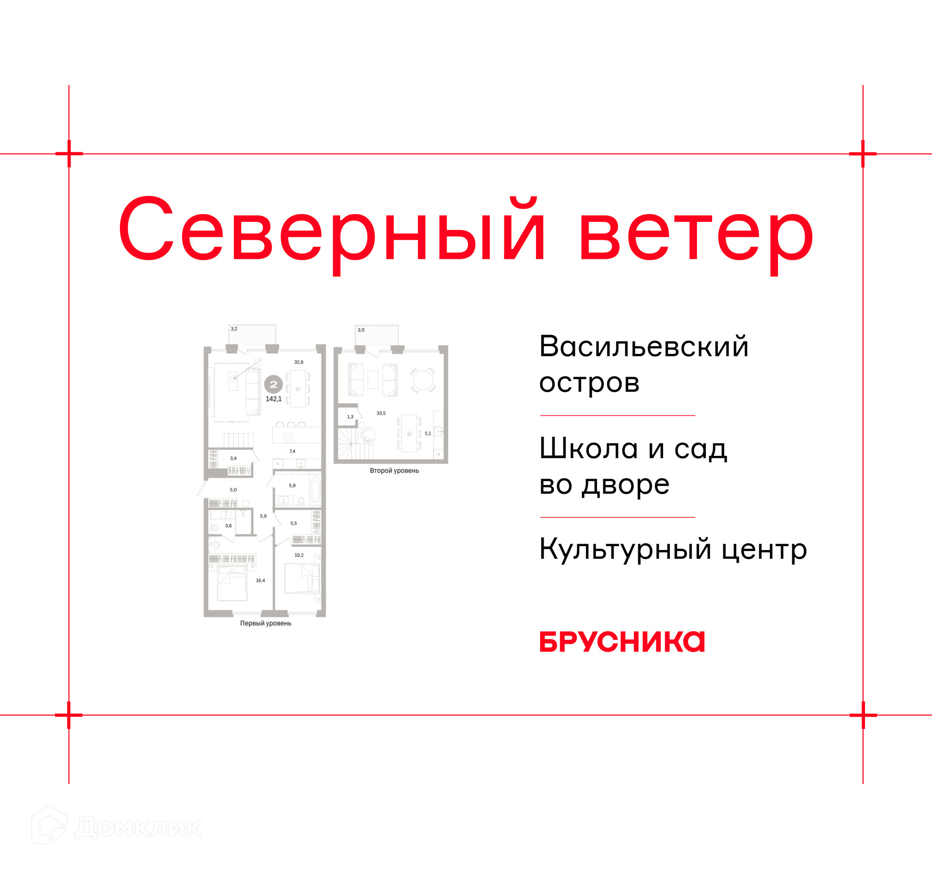 Квартал “Северный ветер” - проект у залива с парком, арт-локациями и богатой инфраструктурой. В проекте представлены дома с разнообразными планировочными решениями: квартиры с мастер-спальнями и большими кухнями, двухуровневые квартиры, террасы на первых и верхних этажах, квартиры с отдельным входом и палисадником, квартиры с видом на залив, уникальные трехэтажные таунхаусы. Всего - 67 типов планировочных решений. Высокие потолки от трех метров - даже на типовых этажах - и панорамные окна в пол наполнят квартиры светом и воздухом. Каждая деталь здесь проработана досконально: интерьерные лобби и холлы, парадные с живыми растениями, ярким декором и мягкой мебелью, дизайнерский паркинг. Ярким акцентом проекта станут веранды - просторные остекленные помещения на крыше урбан-вилл. Расположение, транспортная доступность Васильевский остров давно стал центром притяжения коренных петербуржцев и гостей города. Это локация неразрывно связана с историей Санкт-Петербурга, а сегодня Васильевский - один из самых престижных районов города. Здесь располагаются сильнейшие гимназии и ВУЗы, входящие в ТОП-100 по стране, гастрономические и культурные пространства, а когда хочется красивых закатов, можно отправиться гулять по живописной Университетской набережной или вдохновляться видами Финского залива. Именно здесь, на берегу большой воды, расположился квартал “Северный ветер”. До выезда на ЗСД, который связывает жителей Васильевского острова с любым районом Петербурга, всего 3 минуты на автомобиле. Дорога до Невского проспекта займет 25 минут, а до аэропорта Пулково - 30-35 минут. Ближайшая станция метро - Приморская, 10 минут на автомобиле. В 3-х минутах пешком - остановка общественного транспорта “пр. Крузенштерна”. В планах развития города строительство станции метро “Морской Фасад”. Инфраструктура В основу концепции проекта легла идея деления квартала на шесть кластеров — активный городской, тихий природный, спортивный, семейный, культурный и рекреационный. Внутри каждого кластера будут организованы разные по характеру площади со своим назначением. Событийная — для массовых мероприятий, гастрономическая — для вкусных перекусов, спортивная — чтобы держать себя в форме, площадь спокойствия и тишины — для отдыха и семейная — для игр с детьми. Всё это свяжет кольцевой бульвар, соединенный с большим парком и сопровождаемый водными аллеями по периметру всего квартала. Гуляя по кольцу, вы сможете выбрать пространство, которое в текущий момент рифмуется с вашим настроением. В центре квартала расположится школа и детский сад. Первые этажи домов со стороны двора займут помещения коммерческой функции: всевозможные рестораны и винотеки, магазины одежды и предметов декора, супермаркет, медклиника, пекарни и кофейни. На западной стороне в глубине парковой зоны разместится «тихая» коммерция — SPA, студии массажа, студии дополнительного образования. Со стороны улицы расположатся магазины, гастробары, салоны красоты, аптеки и цветочные лавки. Многофункциональный культурный центр станет точкой сборки множества общественных функций. В соседском центре - визитной карточке Брусники - можно будет работать и назначать бизнес-встречи, организовывать общие собрания собственников, семейные праздники или турниры по шахматам, читать лекции, прово