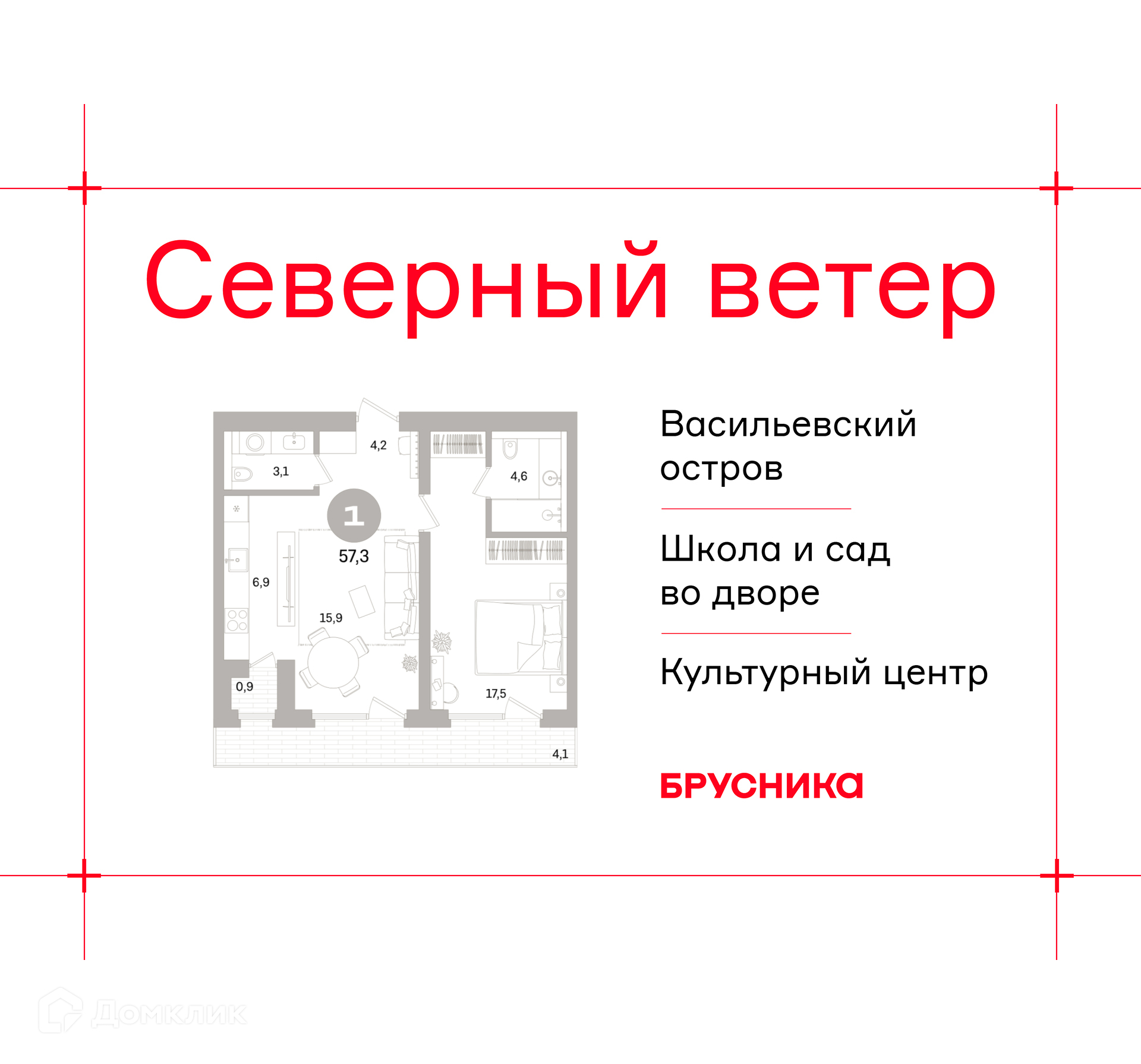 Квартал “Северный ветер” - проект у залива с парком, арт-локациями и богатой инфраструктурой. В проекте представлены дома с разнообразными планировочными решениями: квартиры с мастер-спальнями и большими кухнями, двухуровневые квартиры, террасы на первых и верхних этажах, квартиры с отдельным входом и палисадником, квартиры с видом на залив, уникальные трехэтажные таунхаусы. Всего - 67 типов планировочных решений. Высокие потолки от трех метров - даже на типовых этажах - и панорамные окна в пол наполнят квартиры светом и воздухом. Каждая деталь здесь проработана досконально: интерьерные лобби и холлы, парадные с живыми растениями, ярким декором и мягкой мебелью, дизайнерский паркинг. Ярким акцентом проекта станут веранды - просторные остекленные помещения на крыше урбан-вилл. Расположение, транспортная доступность Васильевский остров давно стал центром притяжения коренных петербуржцев и гостей города. Это локация неразрывно связана с историей Санкт-Петербурга, а сегодня Васильевский - один из самых престижных районов города. Здесь располагаются сильнейшие гимназии и ВУЗы, входящие в ТОП-100 по стране, гастрономические и культурные пространства, а когда хочется красивых закатов, можно отправиться гулять по живописной Университетской набережной или вдохновляться видами Финского залива. Именно здесь, на берегу большой воды, расположился квартал “Северный ветер”. До выезда на ЗСД, который связывает жителей Васильевского острова с любым районом Петербурга, всего 3 минуты на автомобиле. Дорога до Невского проспекта займет 25 минут, а до аэропорта Пулково - 30-35 минут. Ближайшая станция метро - Приморская, 10 минут на автомобиле. В 3-х минутах пешком - остановка общественного транспорта “пр. Крузенштерна”. В планах развития города строительство станции метро “Морской Фасад”. Инфраструктура В основу концепции проекта легла идея деления квартала на шесть кластеров — активный городской, тихий природный, спортивный, семейный, культурный и рекреационный. Внутри каждого кластера будут организованы разные по характеру площади со своим назначением. Событийная — для массовых мероприятий, гастрономическая — для вкусных перекусов, спортивная — чтобы держать себя в форме, площадь спокойствия и тишины — для отдыха и семейная — для игр с детьми. Всё это свяжет кольцевой бульвар, соединенный с большим парком и сопровождаемый водными аллеями по периметру всего квартала. Гуляя по кольцу, вы сможете выбрать пространство, которое в текущий момент рифмуется с вашим настроением. В центре квартала расположится школа и детский сад. Первые этажи домов со стороны двора займут помещения коммерческой функции: всевозможные рестораны и винотеки, магазины одежды и предметов декора, супермаркет, медклиника, пекарни и кофейни. На западной стороне в глубине парковой зоны разместится «тихая» коммерция — SPA, студии массажа, студии дополнительного образования. Со стороны улицы расположатся магазины, гастробары, салоны красоты, аптеки и цветочные лавки. Многофункциональный культурный центр станет точкой сборки множества общественных функций. В соседском центре - визитной карточке Брусники - можно будет работать и назначать бизнес-встречи, организовывать общие собрания собственников, семейные праздники или турниры по шахматам, читать лекции, прово