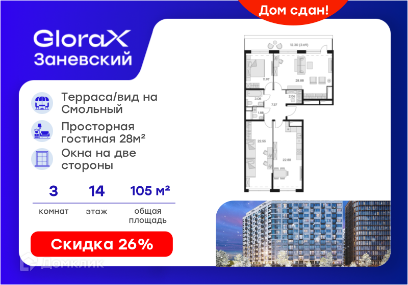 О жилом комплексе. GloraX Заневский — новый мультиформатный жилой комплекс на Заневском проспекте. Это масштабный, выразительный проект для стильных, активных людей, живущих в ритме большого города, для всех, кто не готов идти на компромиссы в вопросах комфорта и качества жизни. Расположение, транспортная доступность. Благодаря удачному расположению GloraX Заневский и развитой транспортной инфраструктуре района вы сможете в кратчайшие сроки оказаться в любой точке города не только на личном, но и на общественном транспорте. 2 минуты до станции метро "Ладожская", 10 минут до Московского вокзала, 20 минут до ул. Рубинштейна и Дворцовой площади. Инфраструктура. В GloraX Заневский мы воплотили инновационную концепцию создания коммерческой инфраструктуры, которая включает в себя помещения различного назначения от интерьерных лавок до медицинского центра, все социально значимые объекты находятся в непосредственной близости. В помещениях стрит-ритейла на первых этажах жилых домов откроется большой сетевой супермаркет премиального уровня, уютные кафе и элитные рестораны. Вы всегда сможете пригласить друзей на ужин в семейный ресторанчик, выпить кофе со свежей выпечкой в мини-пекарне или отведать домашние десерты в кондитерской. Также здесь откроются аптеки, студии красоты, клиники, стоматология, магазин цветов, студия танцев и экомаркет, где вас каждый день будут ждать натуральные продукты, свежие овощи и фрукты со всего мира. Архитектура. Для разработки концепции проекта GloraX Заневский мы пригласили ведущее петербургское бюро «А. Лен». Светлые фасады в стиле минимализма помогают создать акцент на четких геометрических линиях домов, а лоджии, французские балконы и разноразмерные окна делают облик зданий динамичным и выделяющимся. Они задают тон всему окружению и, несомненно, являются бенчмарком среди других комплексов в локации. В рамках проекта будут возведены секции в 14 этажей и одна секция в 6 этажей. Разноэтажность домов, ступенчатая архитектура фасадов, контрастные элементы и цветовые решения еще более подчеркивают эксклюзивность и статусность проекта. Дворы будут свободны от автомобилей благодаря отапливаемому подземному паркингу с дополнительными сервисами. Застройщик реализует концепцию «умный дом» — жители смогут управлять домашними системами со смартфона, а IP-домофоны будут оснащены функциями распознавания лиц и видеонаблюдения. Школа в шаге от дома GloraX Заневский располагается в районе с развитой социальной инфраструктурой, обеспечивающей доступ к лучшим общественным учреждениям. В пределах 20-минутной прогулки располагается более 10 государственных и частных школ. Для маленьких жителей, кому еще рано идти в школу, предлагаются благоустроенные детские сады в радиусе 1 км: № 1, 7, 9, 15, 16 и 67. Часть из этих садов с логопедическим уклоном. Надежность застройщика. ЖК GloraX Заневский — это проект девелоперской компании GloraX. Компания активно развивается, работая над проектами не только в Санкт-Петербурге, но и в Москве, и в Нижнем Новгороде. В портфеле у застройщика 13 реализованных проектов. Компания GloraX основана в 2014 году, специализируется на строительстве жилых комплексов, коммерческой недвижимости и объектов социальной инфраструктуры. Земельный банк GloraX насчитывает более 2,5 млн м², в активной стадии строительства боле