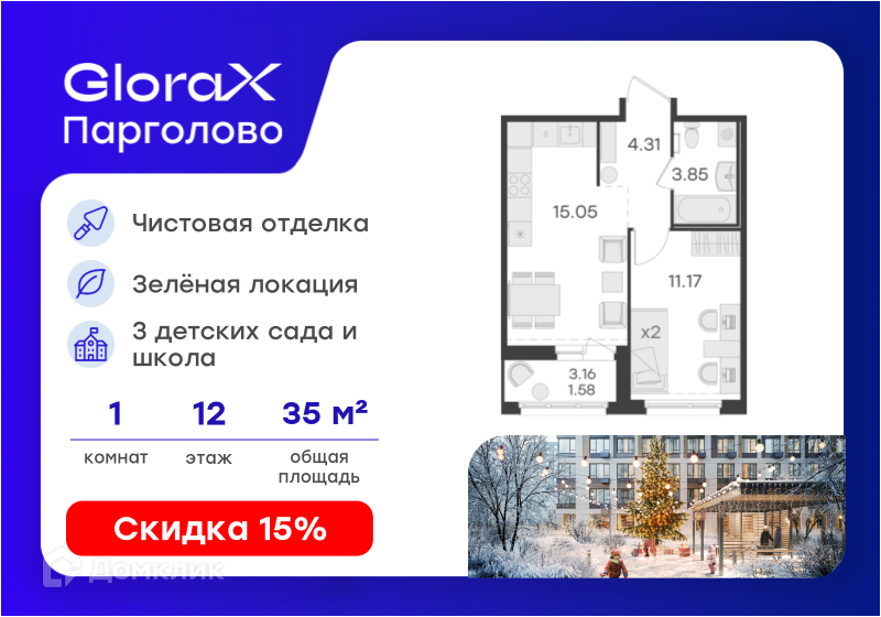 «GloraX Парголово» — большой проект жилой застройки комфорт-класса в Санкт-Петербурге, в 15 минутах езды от метро «Проспект Просвещения». Здесь можно купить квартиру евроформата или со стандартной планировкой, с базовой отдекой White Box и возможностью дозаказа чистовой отделки на выбор. Срок сдачи первого корпуса — 2025 год. Расположение, транспортная доступность Жилой комплекс «GloraX Парголово» строится в Выборгском районе Санкт-Петербурга. Территориально он относится к посёлку Парголово. За 7 минут отсюда можно доехать до станции электричек «Парголово», за 10 минут — до Кольцевой автомобильной дороги (КАД), а за 15 минут — до съезда на Западный скоростной диаметр (ЗСД). В 20 минутах езды на машине находится станция метро «Комендантский проспект». До метро можно добраться и на автобусе: дорога в пути до станций «Озерки» и «Проспект Просвещения» займёт 35 минут. Инфраструктура Территория комплекса будет поделена на две зоны: активную, с игровыми площадками и тренажёрами, и спокойную, с шезлонгами и беседками. Там можно будет даже работать на свежем воздухе: столы в беседках сделают с розетками. Ещё на улице проведут Wi-Fi. Внутренний двор будет полностью пешеходным и закрытым от машин. Рядом с проектом в 2025 году появятся три детских сада и одна школа. В большинстве зданий на первых этажах откроются магазины, кафе и другие коммерческие объекты. В 3 очереди проекта появится комьюнити-центр с коворкингом, детской комнатой, спортивным залом и кофепойнтом. Во всех зданиях на первых этажах будут отведены места под колясочные. По желанию можно приобрести индивидуальный келлер — кладовку. Паркинг в ЖК будет в отдельно стоящем здании на 4–5 этажей. Надёжность застройщика GloraХ – федеральный девелопер, специализирующийся на строительстве жилых комплексов, коммерческой недвижимости и социальных объектов. Компания была создана в 2014 году. За время работы GloraX зарекомендовал себя как успешный застройщик и партнер, сдав в эксплуатацию ряд проектов общей площадью 688 тыс. кв. м. География деятельности компании охватывает несколько регионов: Москву, Санкт-Петербург, Ленинградскую область, Нижний Новгород и Казань. Архитектура Все здания в комплексе — 15-этажные, со штукатурным фасадом и керамогранитной плиткой на уровне первого этажа. В двух очередях можно докупить чистовую отделку, а также мебель и технику. Готовая отделка представлена в двух цветовых оттенках — тёмном и светлом. В неё входят обои под покраску, ламинат, матовый натяжной потолок, оборудованные санузлы с ванной и душем. Во всех квартирах есть лоджии — кроме тех, что на первом этаже. Пол в лоджиях покрыт керамогранитной плиткой, также там есть светильник и розетка. К продаже доступны студии от 28 м² и квартиры с максимальной площадью 87,5 м².