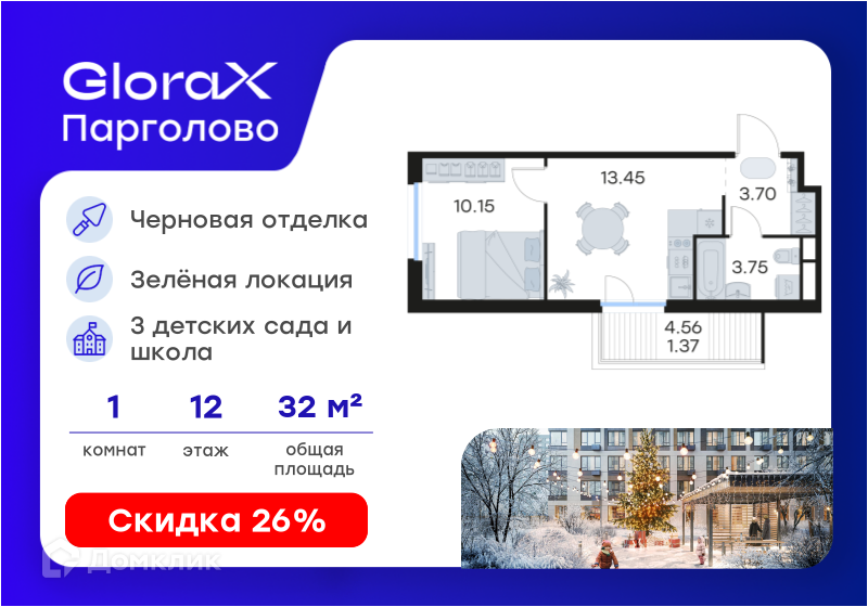 «GloraX Парголово» — большой проект жилой застройки комфорт-класса в Санкт-Петербурге, в 15 минутах езды от метро «Проспект Просвещения». Здесь можно купить квартиру евроформата или со стандартной планировкой, с базовой отдекой White Box и возможностью дозаказа чистовой отделки на выбор. Срок сдачи первого корпуса — 2025 год. Расположение, транспортная доступность Жилой комплекс «GloraX Парголово» строится в Выборгском районе Санкт-Петербурга. Территориально он относится к посёлку Парголово. За 7 минут отсюда можно доехать до станции электричек «Парголово», за 10 минут — до Кольцевой автомобильной дороги (КАД), а за 15 минут — до съезда на Западный скоростной диаметр (ЗСД). В 20 минутах езды на машине находится станция метро «Комендантский проспект». До метро можно добраться и на автобусе: дорога в пути до станций «Озерки» и «Проспект Просвещения» займёт 35 минут. Инфраструктура Территория комплекса будет поделена на две зоны: активную, с игровыми площадками и тренажёрами, и спокойную, с шезлонгами и беседками. Там можно будет даже работать на свежем воздухе: столы в беседках сделают с розетками. Ещё на улице проведут Wi-Fi. Внутренний двор будет полностью пешеходным и закрытым от машин. Рядом с проектом в 2025 году появятся три детских сада и одна школа. В большинстве зданий на первых этажах откроются магазины, кафе и другие коммерческие объекты. В 3 очереди проекта появится комьюнити-центр с коворкингом, детской комнатой, спортивным залом и кофепойнтом. Во всех зданиях на первых этажах будут отведены места под колясочные. По желанию можно приобрести индивидуальный келлер — кладовку. Паркинг в ЖК будет в отдельно стоящем здании на 4–5 этажей. Надёжность застройщика GloraХ – федеральный девелопер, специализирующийся на строительстве жилых комплексов, коммерческой недвижимости и социальных объектов. Компания была создана в 2014 году. За время работы GloraX зарекомендовал себя как успешный застройщик и партнер, сдав в эксплуатацию ряд проектов общей площадью 688 тыс. кв. м. География деятельности компании охватывает несколько регионов: Москву, Санкт-Петербург, Ленинградскую область, Нижний Новгород и Казань. Архитектура Все здания в комплексе — 15-этажные, со штукатурным фасадом и керамогранитной плиткой на уровне первого этажа. В двух очередях можно докупить чистовую отделку, а также мебель и технику. Готовая отделка представлена в двух цветовых оттенках — тёмном и светлом. В неё входят обои под покраску, ламинат, матовый натяжной потолок, оборудованные санузлы с ванной и душем. Во всех квартирах есть лоджии — кроме тех, что на первом этаже. Пол в лоджиях покрыт керамогранитной плиткой, также там есть светильник и розетка. К продаже доступны студии от 28 м² и квартиры с максимальной площадью 87,5 м².