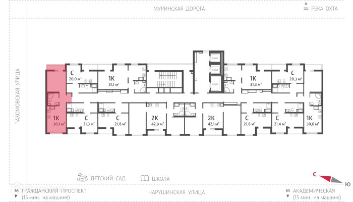 - Общая площадь: 30.6 м²