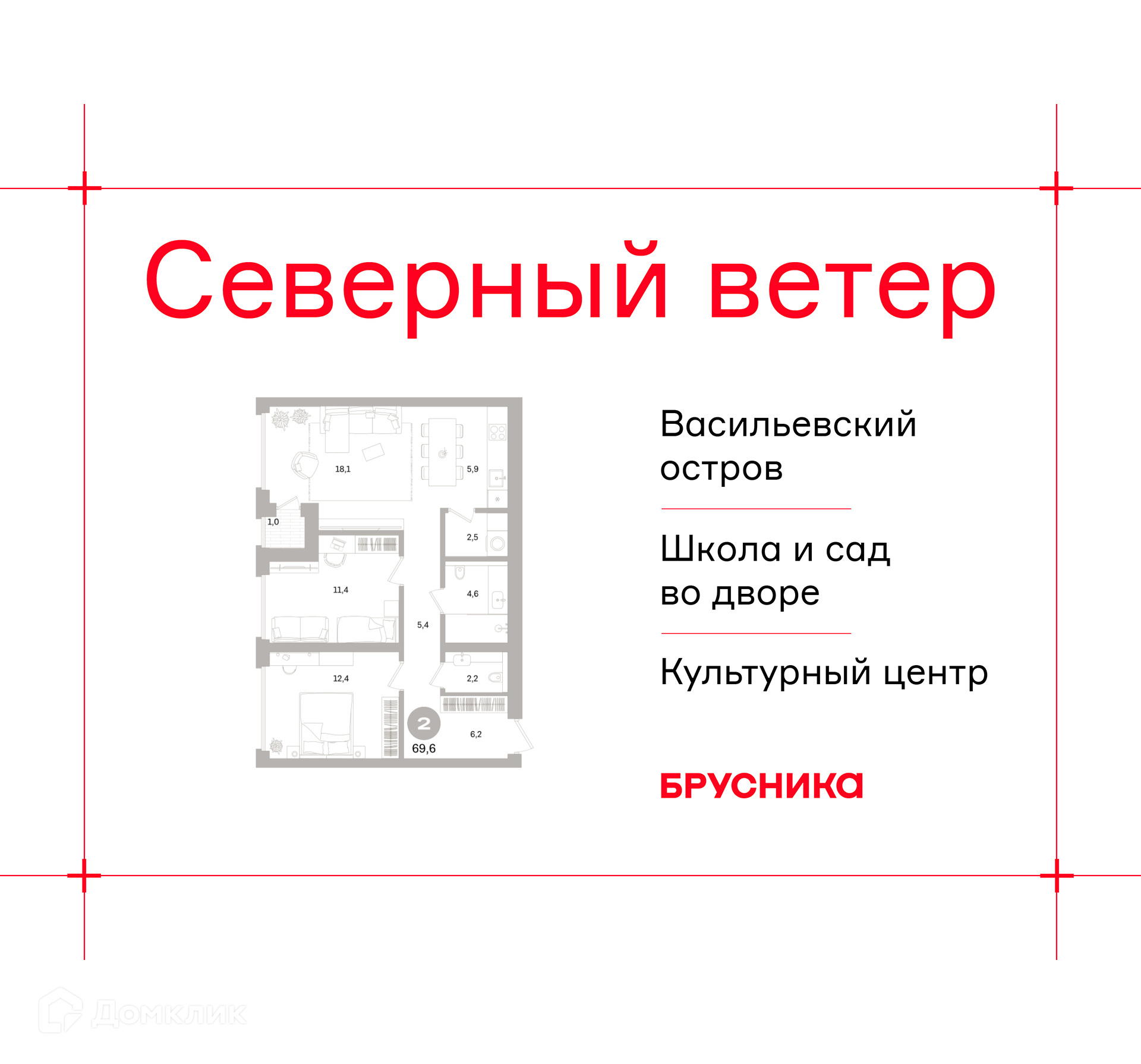 Квартал “Северный ветер” - проект у залива с парком, арт-локациями и богатой инфраструктурой. В проекте представлены дома с разнообразными планировочными решениями: квартиры с мастер-спальнями и большими кухнями, двухуровневые квартиры, террасы на первых и верхних этажах, квартиры с отдельным входом и палисадником, квартиры с видом на залив, уникальные трехэтажные таунхаусы. Всего - 67 типов планировочных решений. Высокие потолки от трех метров - даже на типовых этажах - и панорамные окна в пол наполнят квартиры светом и воздухом. Каждая деталь здесь проработана досконально: интерьерные лобби и холлы, парадные с живыми растениями, ярким декором и мягкой мебелью, дизайнерский паркинг. Ярким акцентом проекта станут веранды - просторные остекленные помещения на крыше урбан-вилл. Расположение, транспортная доступность Васильевский остров давно стал центром притяжения коренных петербуржцев и гостей города. Это локация неразрывно связана с историей Санкт-Петербурга, а сегодня Васильевский - один из самых престижных районов города. Здесь располагаются сильнейшие гимназии и ВУЗы, входящие в ТОП-100 по стране, гастрономические и культурные пространства, а когда хочется красивых закатов, можно отправиться гулять по живописной Университетской набережной или вдохновляться видами Финского залива. Именно здесь, на берегу большой воды, расположился квартал “Северный ветер”. До выезда на ЗСД, который связывает жителей Васильевского острова с любым районом Петербурга, всего 3 минуты на автомобиле. Дорога до Невского проспекта займет 25 минут, а до аэропорта Пулково - 30-35 минут. Ближайшая станция метро - Приморская, 10 минут на автомобиле. В 3-х минутах пешком - остановка общественного транспорта “пр. Крузенштерна”. В планах развития города строительство станции метро “Морской Фасад”. Инфраструктура В основу концепции проекта легла идея деления квартала на шесть кластеров — активный городской, тихий природный, спортивный, семейный, культурный и рекреационный. Внутри каждого кластера будут организованы разные по характеру площади со своим назначением. Событийная — для массовых мероприятий, гастрономическая — для вкусных перекусов, спортивная — чтобы держать себя в форме, площадь спокойствия и тишины — для отдыха и семейная — для игр с детьми. Всё это свяжет кольцевой бульвар, соединенный с большим парком и сопровождаемый водными аллеями по периметру всего квартала. Гуляя по кольцу, вы сможете выбрать пространство, которое в текущий момент рифмуется с вашим настроением. В центре квартала расположится школа и детский сад. Первые этажи домов со стороны двора займут помещения коммерческой функции: всевозможные рестораны и винотеки, магазины одежды и предметов декора, супермаркет, медклиника, пекарни и кофейни. На западной стороне в глубине парковой зоны разместится «тихая» коммерция — SPA, студии массажа, студии дополнительного образования. Со стороны улицы расположатся магазины, гастробары, салоны красоты, аптеки и цветочные лавки. Многофункциональный культурный центр станет точкой сборки множества общественных функций. В соседском центре - визитной карточке Брусники - можно будет работать и назначать бизнес-встречи, организовывать общие собрания собственников, семейные праздники или турниры по шахматам, читать лекции, прово