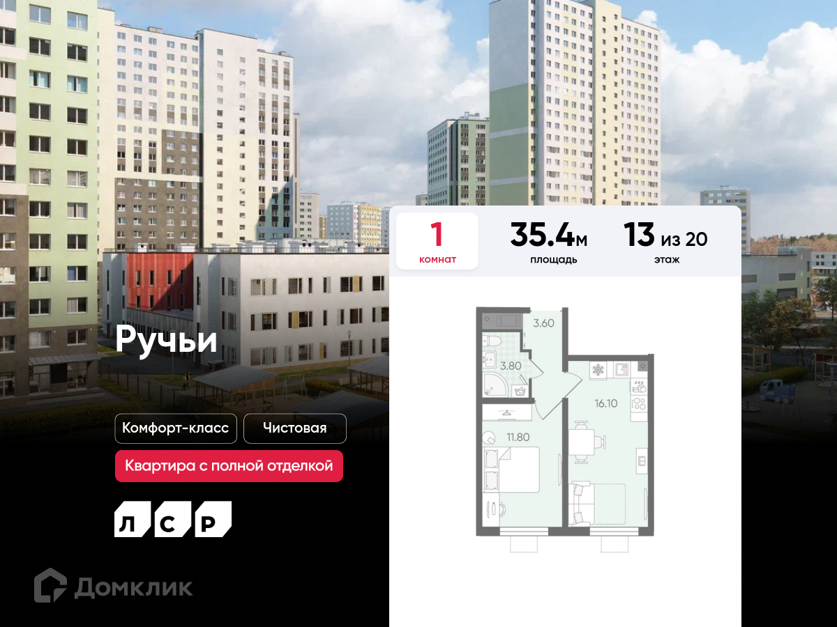 Доступна к покупке 1-комнатная квартира в новом жилом комплексе "ЖК Ручьи" 🏢. Квартира расположена на 13-м этаже 20-этажного дома. Прекрасный выбор для комфортной жизни.