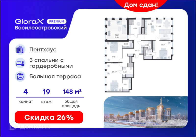 Доступна к покупке 4-комнатная квартира в новом жилом комплексе "ЖК GloraX Premium Василеостровский" 🏢. Квартира расположена на 19-м этаже 20-этажного дома. Прекрасный выбор для семьи.