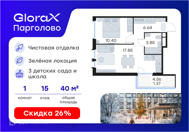«GloraX Парголово» — большой проект жилой застройки комфорт-класса в Санкт-Петербурге, в 15 минутах езды от метро «Проспект Просвещения». Здесь можно купить квартиру евроформата или со стандартной планировкой, с базовой отдекой White Box и возможностью дозаказа чистовой отделки на выбор. Срок сдачи первого корпуса — 2025 год. Расположение, транспортная доступность Жилой комплекс «GloraX Парголово» строится в Выборгском районе Санкт-Петербурга. Территориально он относится к посёлку Парголово. За 7 минут отсюда можно доехать до станции электричек «Парголово», за 10 минут — до Кольцевой автомобильной дороги (КАД), а за 15 минут — до съезда на Западный скоростной диаметр (ЗСД). В 20 минутах езды на машине находится станция метро «Комендантский проспект». До метро можно добраться и на автобусе: дорога в пути до станций «Озерки» и «Проспект Просвещения» займёт 35 минут. Инфраструктура Территория комплекса будет поделена на две зоны: активную, с игровыми площадками и тренажёрами, и спокойную, с шезлонгами и беседками. Там можно будет даже работать на свежем воздухе: столы в беседках сделают с розетками. Ещё на улице проведут Wi-Fi. Внутренний двор будет полностью пешеходным и закрытым от машин. Рядом с проектом в 2025 году появятся три детских сада и одна школа. В большинстве зданий на первых этажах откроются магазины, кафе и другие коммерческие объекты. В 3 очереди проекта появится комьюнити-центр с коворкингом, детской комнатой, спортивным залом и кофепойнтом. Во всех зданиях на первых этажах будут отведены места под колясочные. По желанию можно приобрести индивидуальный келлер — кладовку. Паркинг в ЖК будет в отдельно стоящем здании на 4–5 этажей. Надёжность застройщика GloraХ – федеральный девелопер, специализирующийся на строительстве жилых комплексов, коммерческой недвижимости и социальных объектов. Компания была создана в 2014 году. За время работы GloraX зарекомендовал себя как успешный застройщик и партнер, сдав в эксплуатацию ряд проектов общей площадью 688 тыс. кв. м. География деятельности компании охватывает несколько регионов: Москву, Санкт-Петербург, Ленинградскую область, Нижний Новгород и Казань. Архитектура Все здания в комплексе — 15-этажные, со штукатурным фасадом и керамогранитной плиткой на уровне первого этажа. В двух очередях можно докупить чистовую отделку, а также мебель и технику. Готовая отделка представлена в двух цветовых оттенках — тёмном и светлом. В неё входят обои под покраску, ламинат, матовый натяжной потолок, оборудованные санузлы с ванной и душем. Во всех квартирах есть лоджии — кроме тех, что на первом этаже. Пол в лоджиях покрыт керамогранитной плиткой, также там есть светильник и розетка. К продаже доступны студии от 28 м² и квартиры с максимальной площадью 87,5 м².